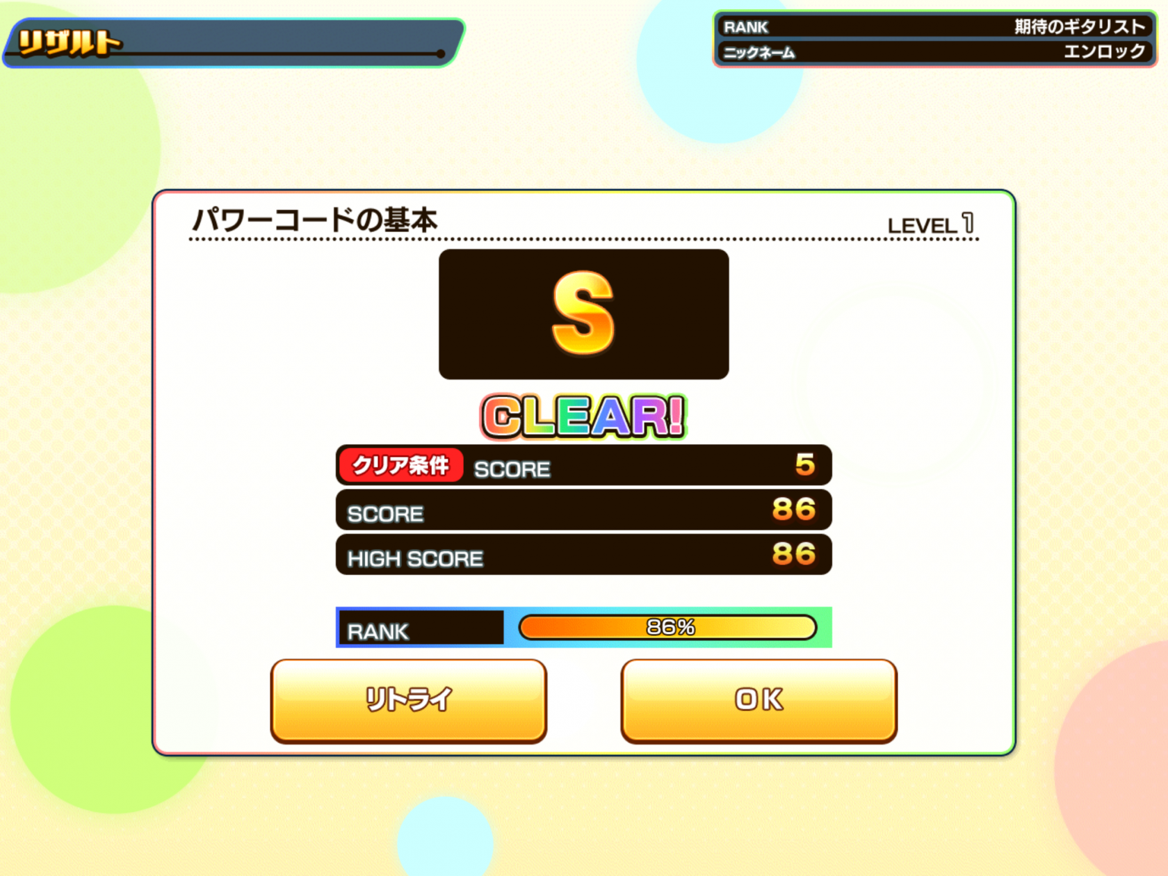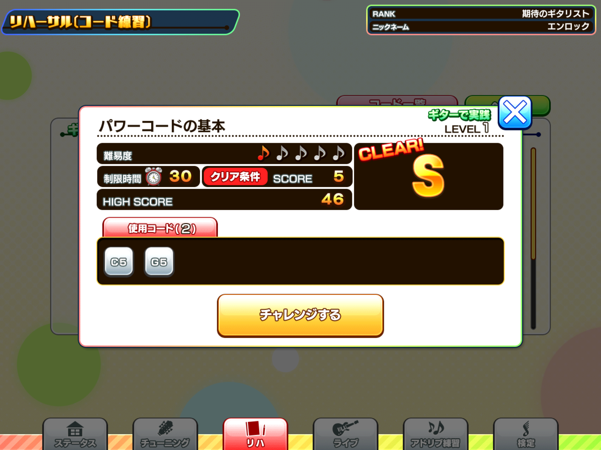 レベル2で辛くも13回コード弾いての努力でした。